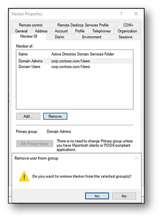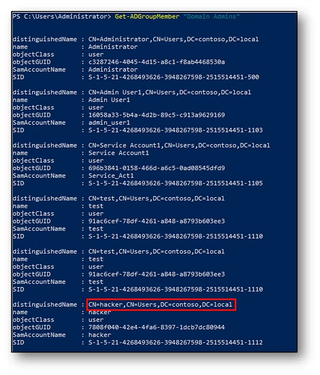 After the attack, the Hacker user account primary group has been changed to Domain Admins but has lost its membership to the Domain Users group.
