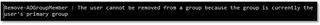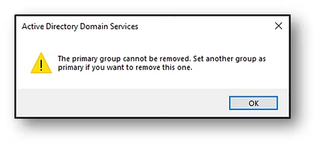 When attempting to remove group membership for a primary group using AD Users and Computers (ADUC), the Administrator is met with this message: