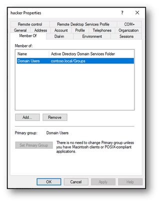 Prior to these changes, the Hacker user account was only a member of the Domain Users group. By default, Domain Users is also configured as Hacker's primary group.