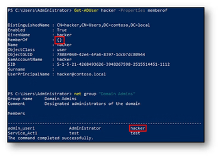 The Hacker user account has been added to the Domain Admins group and configured with it as the primaryGroupID. Seen above, Get-ADGroup does not list Hacker as a member, whereas Get-ADGroupMember does. When we look at it from the user perspective it’s equally confusing. The Get-ADUser cmdlet shows an empty memberOf attribute, yet running net group will list Hacker as a member.