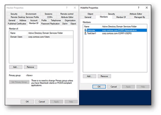 Once a user has the deny permissions configured and any (unprotected) group set as the primary group, it becomes invisible on both the user and the group object. In this example, the user Hacker is a member of the HideMe group. Notice the HideMe group is missing from the member tab and the primary group reports as < None>. Hacker also does not appear in the member tab of the HideMe group.