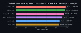 The three (3) Qwen variants provide intra-family comparisons across size and code-specific training. The three (3) non-Qwen models (gemma4, devstral, nemotron) test whether results generalize across model families. 100 runs per challenge per model produces confidence intervals narrow enough to distinguish meaningfully different pass rates.