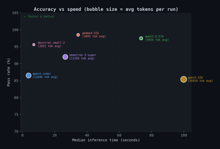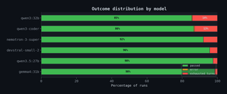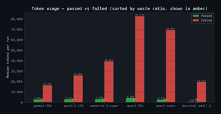 In terms of token efficiency, devstral uses 2,651 tokens per run on average. qwen3:32b uses 16,924, over six (6) times as many, while achieving the lowest pass rate. nemotron and qwen3-coder are both verbose at approximately 11,000 tokens per run, with no corresponding improvement in accuracy.