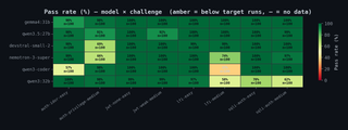 Each model gets 100 attempts at each challenge. At lower run counts, the variance is too high to draw conclusions from; the difference between a 10% and 30% pass rate on 10 runs is one (1) versus three (3) passes. 100 runs per challenge produces 4,800 total runs across six (6) models and eight (8) challenges. All inference runs through Ollama on a local server.