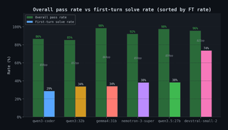 devstral solves 77% of its passing runs on the first tool call. nemotron is next at 41.6%, then qwen3:32b at 39.7% and qwen3.5 at 39.4%. gemma4 (34.6%) and qwen3-coder (33.4%) have the lowest first-turn solve rates but higher overall pass rates, indicating they benefit from additional turns.