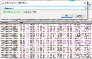 Next, we will compare the contents of the unmodified amsi.dll entry point to the modified version. The AMSI.dll's entry point is at the address of 0x7ffb0bcde820, and the first image shows the contents of that address directly before the malicious code is moved in. The second image shows the same entry point after the malicious shellcode overwrote it.