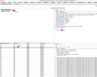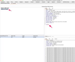 Now, these two (2) requests are lumped into a cluster with many others, even though they’re clearly different. These would be easy to spot in Intruder using normal methods of checking response size, status code, and content-type, but it’s interesting that the fast/default algorithm clusters these poorly.