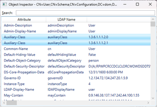 This doesn’t tell the full story, though, as it only covers structural classes, determined by the Object-Class-Category. The directory also contains abstract and auxiliary classes. These are covered more in Structural, Abstract, and Auxiliary Classes in the documentation, but briefly, an abstract class cannot be instantiated and can only inherit another abstract class; an auxiliary class cannot be instantiated but can be used to group attributes and add those to a derived class; and a structural class can be instantiated, can inherit from a structural or abstract class, and can reference one or more auxiliary classes. Auxiliary classes are not listed in the Object-Class attribute as they are not part of the superclass chain. Instead, a class references auxiliary classes using the Auxiliary-Class attribute.