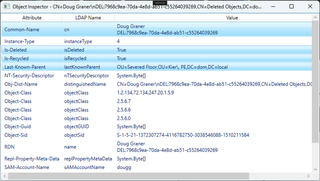What is a “delete-mangled RDN”? In the above example, Mr. Graner’s account was deleted for, well, reasons. Notice the Common-Name in the screenshot. It has Graner's presumed previous CN, then a line break (LF), then DEL: followed by a GUID. When this record is replicated to other DCs, they’ll know to delete the corresponding object. Note that, in this case, record and object aren’t the same thing. According to that same [MS-ADTS] article, once an object is deleted, it is no longer an object in the eyes of LDAP. This means that LDAP won’t return this record unless you specify special control options for the LDAP query. This makes it possible to find and restore items deleted by mistake by using an LDAP tool (such as ldp.exe) to use these special controls.