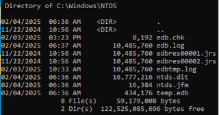 copy \\?\GLOBALROOT\Device\HarddiskVolumeShadowCopyN\Windows\NTDS\NTDS.dit <location of your choice>You can replace the NTDS.dit part above with * to copy all files from that directory, including the transaction logs. Either way though, you’ll likely need to run the repair process described below.