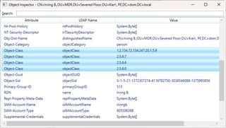 Closely related to Object-Class is Object-Category. It references the Governs-ID of an object class, like Object-Class, but can only contain a single value. You may have noticed on the Irving B. account above, Object-Category is set to Person, which is in the superclass chain of User. Quoting the documentation: