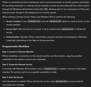 As an example, I asked llama3, deepseek-1, and ChatGPT GPT-4o how PSExec creates a service. Out of these, ChatGPT gave the most concise and technically accurate response.