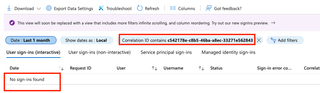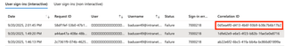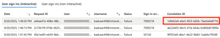 - The first attempt will be a failed login that generates a normal failed sign-in log. This failed sign-in also generates a 'Correlation ID' that we can use as a reference point in our logs.