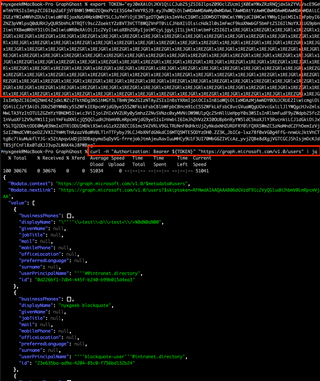 In the following screenshot, I export the token to the variable TOKEN so we can easily use it with curl. I then demonstrate that the token is valid by making a Graph API request with it.