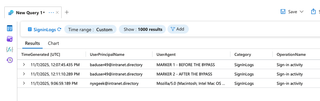 Reviewing the log analytics, I can confidently say that these were dropped entirely from the sign-in logs. In the demo video, I had sent a normal request with a user-agent of MARKER 1 – BEFORE THE BYPASS. After performing multiple authentications using the logging bypasses, I sent another normal request with a user-agent of MARKER 2 – AFTER THE BYPASS. In my Log Analytics workspace, we can see that none of the bypassed sign-in logs made it to Log Analytics. Only our MARKER 1 and MARKER 2 entries are visible from our tests.