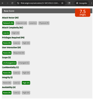 Putting that all into the calculator, we see it comes out as a High, with a 7.5 CVSS v3.1 score.