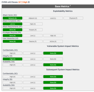 If we compute it in CVSS v4.0, which contains the same language for the Integrity metric, we come out with an even higher rating of 8.7.