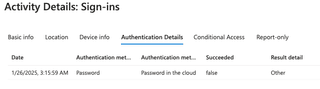 Notice how the Succeeded column for the Password authentication indicates false. If you were an admin reviewing this log, there is no indicator of a compromised credential.