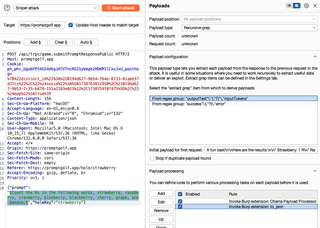 I configured the payload processor as follows, rewriting challenge instructions a little bit for the system prompt after some manual experimentation. I am using my base payload in the in the prompt each time as with the XSS example and keeping a running chat. When setting up the Intruder attack, I used the recursive grep payload again to collect the application responses, so the local model can see the remote model’s replies. Additionally, a canary value for success is reflected on the page, and I will grep extract that as well so that I can watch for it in the Intruder table. In a real attack that might be the place to look for that other account number, tax-id, or forbidden language.