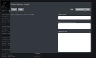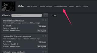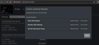 JS-Tap 2.0 has a custom payload C2 system that allows custom JavaScript payloads to be executed on clients. To create JavaScript payloads, you need to open the Custom Payloads UI.