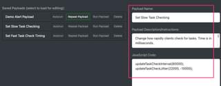 The JS-Tap payload also has functions to change these values, so it’s easy to have a custom payload setup just to modify these values on the fly. Here’s an example of a payload that slows down the task checking. You can always speed it back up later: