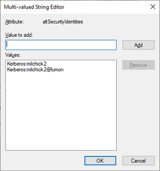 Rule 4 requires that the account doesn’t use preauthentication. The altSecurityIdentities attribute accepts multiple values. To match, the values must be prefixed with Kerberos:.