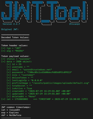 Even if the JWT implementation ends up being secure, the information in the token may still be useful elsewhere during testing. For instance, this Juice Shop token has some interesting-looking claims, like password and totpSecret at a minimum, and those may end up contributing to attacks that are not specifically tied to session management.