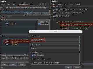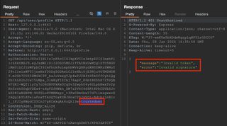 Failure: | Server rejects forged token, often with explicit 401 Unauthorized response code Convert the discovered public key to the other format (either JWK or PEM) and repeat |