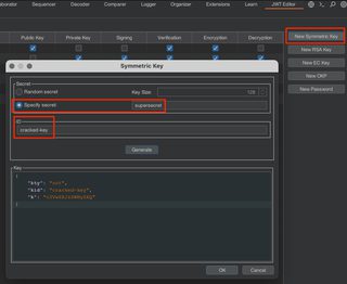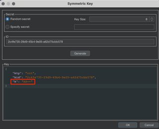 To do this, create a new symmetric key in the JWT Editor extension tab. After generating a new key, update the k value with a value of "AA==". This is the Base64-encoded null byte. Click OK to save the key.