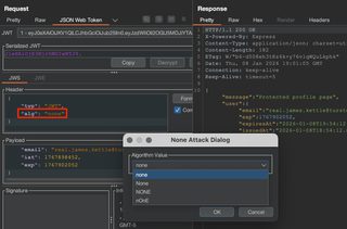 Gather Information | Review token contents with JSON Web Tokens' request/response tab Look for: exp, alg Any other interesting claims e.g., ‘password’, ‘role’, etc. |