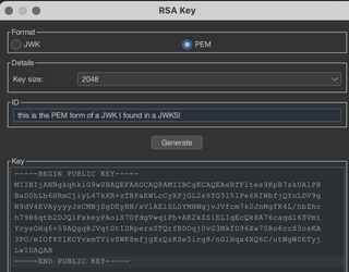 JWT Editor Extension Tab > New RSA Key > Format as JWK > Provide an ID > Paste key > Ok