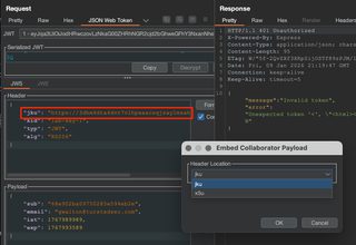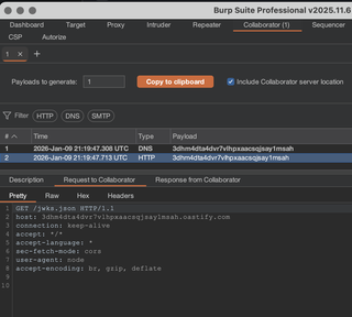 To exploit this flaw, a valid public key will need to be hosted in a network-accessible location, in either JWKS (jku) or PEM (x5u) format. Tokens will need to be signed using the corresponding private key. That complete process is skipped for brevity here, but the Collaborator test is sufficient to demonstrate the issue.