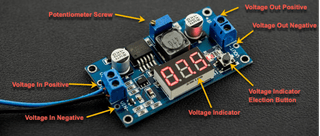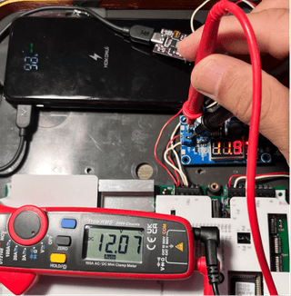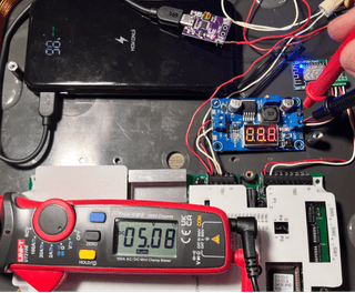 And third, the Power Buck module needs to be configured to allow the appropriate voltage to the ESP RFID Tool. As Shain’s build set the Power Buck module to be 5 volts, I'm doing the same. I purchased a variation of a PowerBoost module that has an onboard voltage indicator. This indicator can be toggled with a black push button next to the screen to view input voltage and output voltage. The first step is to find the wire terminals labeled VIN+ and VIN- to the PD boost module to supply power to the Power Buck module. Make sure to not wire anything to the VOUT terminals yet. Also, the voltage going out must be configured before connecting the ESP RFID Tool.