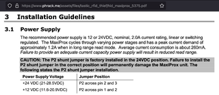 According to the power specifications of the MaxiProx, the power requirement during peak operation is 12 volts at 1.2 amps. The recommended power requirement for the power supply is 12 volts at 2 amps.