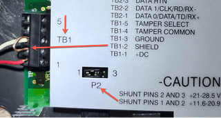 Time to wire it up!!! There are three things that needed to be done before I could power it up. First and most importantly, I need to make sure that the MaxiProx is configured for 12V and not 24V as stated in the figure “HID MaxiProx Power Requirements.” On the MaxiProx, there is a jumper right next to the terminal block (TB1) that the power plugs into. Connecting P1 and P2 supply 12V and connecting P2 and P3 supply 24V. Since we need 12V, we need to hand P1 and P2 connected with the jumper. Now, another thing that I added was a looped wire to connect the ground to the shield.