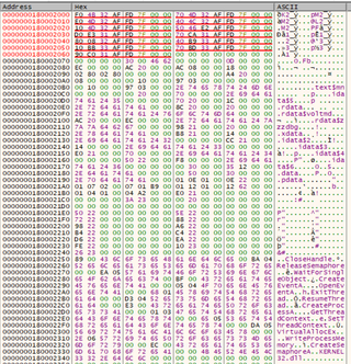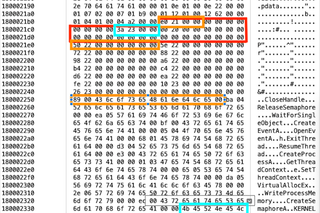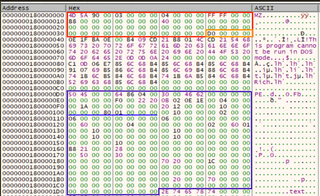 - Line 23-24: Sets the structure of IMAGE_DOS_HEADER to the beginning of the argument buffer. Allowing for quick access to the MZ header. Using the IMAGE_DOS_HEADER we get the offset to the PE header and set a pointer to that part of the argument buffer using the IMAGE_NT_HEADER structure. In Figure 7 the IMAGE_DOS_HEADER is highlighted in RED and the IMAGE_NT_HEADER is highlighted in BLUE. The value located at 0x1800003C, highlighted in Orange, is the offset (0xD0) to the IMAGE_NT_HEADER. 0x18000000 + 0xD0 => 0x180000D0