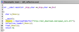 - Lines 259-269: Programs main function. 10 seconds of sleep allowing time to attach a debugger then it downloads the DLL from the provided URI and passes it to the reflective_loader function to load into the current process’s memory.