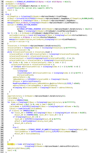 - Line 41: Because VirtualAlloc could potentially return a memory address other than the DLLs preferred location, the difference between the preferred location and the actual location needs to be calculated. This difference is used later when resolving relocations.