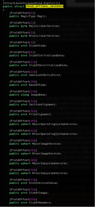 - Line 34: Obtains the size of the DLL as needed when expanded in Memory. The size is located in the OptionalHeader, which is located directly after the File header in the IMAGE_NT_HEADERS structure. Shown in Orange in Figure 8.