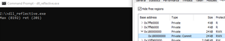 In the previous blog, we discussed DLL Injection. To perform this, we had to load a new DLL into memory using LoadLibrary. This new DLL showed up when looking at the memory and loaded Modules for that process. If you are an experienced defender, you might know just by noticing that one library is out of place in that module list. Reflective Loading bypasses this by not using LoadLibrary and will only show up in the memory layout as an allocated heap, which is very frequent in programs. The only difference is the permission allocated to that section will include Read, Write, and Execute. These permissions can be changed by section to be stealthier, but our example doesn’t. The following image shows the execution of the C program on the left, and on the right is the memory layout for that process. The highlighted line contains our malicious DLL. As you can see it doesn’t stand out as a DLL, but it does have the protection setting to RWX (Read, Write, and Execute).