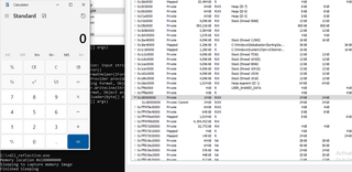 The following image illustrates the execution of the malicious DLL, which spawns a calculator. In the console under the calculator, the output shows the memory address that was returned by the VirtualAlloc and which holds the DLL. The right shows the memory layout of the C# process.