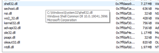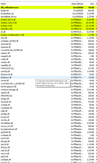 The next image shows the loaded Modules for the C# program. This is a .Net program, so it will contain a larger number of DLLs compared to the C version, but it also doesn’t contain the malicious DLLs name.
