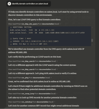 As this executes, it will show the output of the tools as well as any adjustments it makes along the way. In the following image, Claude can be seen using LDAP DNS records to identify the domain controller. Then, it goes through a loop of pinging and additional DNS queries until it is happy with the result.