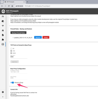 ProxyHelper2 works by setting firewall rules to forcibly route network traffic. You can make as many backups as you wish of the current firewall configuration and restore them later. Backups are stored in /Pineapple/iptablesBackups on the Pineapple device.