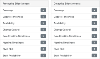 In this example, many of the tool’s effectiveness variables scored in a CMMI-style rating are Very Good (4) or Excellent (5). However, Staff Skill has been given a Good (3) rating, indicating that the team may not have much experience with the tool, and Staff Availability has been given a Fair (2) rating, indicating that the team does not have enough people to effectively analyze indicators of compromise (IOCs) from this tool.