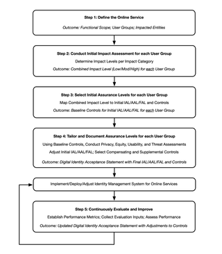 A similar process to define the IAL and FAL as noted in NIST’s Digital Identity Guidelines (NIST SP 800-63-3) is depicted below: