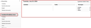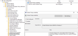 Third, Group Policy Object (GPO) can be used to configure the associated keys and set others that outright disable WebView. The recommended method to attempt using Group Policy is well outlined by Mandiant here. The associated section is titled Locking Down the Registry Keys Using GPO Enforcement. An important note is that the blog post uses a lot of Group Policy Preferences (GPP) settings, and these are just that, preferences. The correct way is to leverage Group Policy settings to prevent the user from manipulating the settings after being set. The most important setting is the Do not allow Home Page URL to be set in folder Properties policy setting. This policy setting will turn off WebView for the folders inside Outlook for the user. There is one exception though, and that is the Outlook Today page. This page is displayed when you press the mailbox name in the navigation. The screenshot below shows the Outlook Today page.