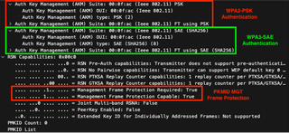 Utilizing Wireshark for analysis, we uploaded the captured packet information and noticed that the captured packet advertised WPA2-PSK and WPA3-SAE. In addition, we observed that PMF protection was enabled for the SSID.