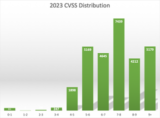 When we look at the distribution of CVSS scores across all CVE IDs issued in the year 2023, we can see that the number of medium, high, and critical are the majority.