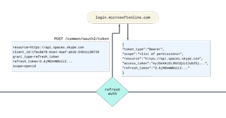 While these tokens are only valid for a given resource and issued on behalf of an application defined by a ‘ClientId’ (GUID string), Microsoft's OAuth implementation allows us to ‘refresh’ into other resources. Let's say we have a valid access token and refresh token for the Microsoft Graph API (resource URI: graph.windows.net). In order to retrieve a new set of tokens for another resource, say Teams (resource URI: api.spaces.skype.com), we use the refresh token for the Graph API but specify a different resource URI in the refresh token POST request.